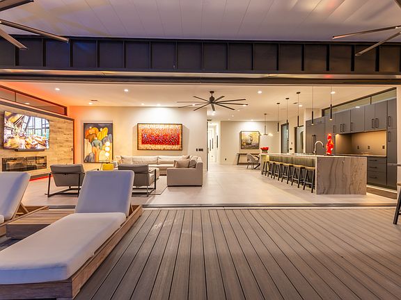 Designed by Merlin Bergeron, the architecture masterfully blends style and functionality. Expansive glass walls invite the lush outdoors in, creating seamless indoor-outdoor living, while thoughtfully placed overhangs provide shade without compromising the stunning views. Hidden behind a custom 8-foot by 6-foot sliding barn door art piece lies a second kitchen, alongside top-of-the-line Thermador appliances, Bosch dishwashers, and integrated Sonos speakers throughout.