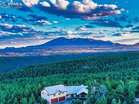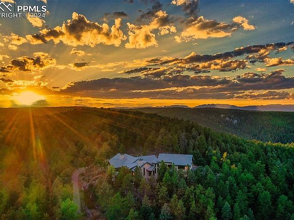 Luxurious Mountain Lodge-Style Retreat w/ Breathtaking Pikes Peak Views. Welcome to your private mountain sanctuary in a majestic gated community. 8,206 square-foot home on 35 acres, nestled in the heart of the Colorado Rockies. Perched at the "Top of the World," this extraordinary residence offers unparalleled, panoramic views of Pikes Peak, inviting you to experience tranquility, privacy, and natural beauty like never before. The home is defined by its amazing custom features, special thought out details. A sunken living room & expansive multiple family rooms, some with vaulted wood beam ceilings, each offering a unique space to gather, relax, or entertain. Cozy up to one of the 4 beautifully built stunning rock fireplaces, there’s always a place to create memories. The heart of the home is its chef’s gourmet kitchen, equipped w/ top-tier appliances, custom cabinetry, granite countertops & center island. Perfect for culinary creativity. This kitchen effortlessly blends functionality w/ style and opens to one of the gorgeous & spacious family rooms w/ a wall of windows eating nook. 2 offices designed for those who work from home or need a quiet space to focus, these spaces are perfect for productivity and reflection. Every room in this stunning home is designed for both comfort and elegance. Escape in your master suite & relax, 2 way fireplace, artistic mountain tile patterns, jetted spa tub & steam shower. Designed walk-in closets. 3 bedroom suites offer attached baths & windows that frame the awe-inspiring mountain vistas. The bathrooms are impeccably finished with high-end fixtures & tasteful tile designs. Above the expansive 4-car garage, you’ll find a fully equipped apartment, a secluded retreat that includes its own kitchen, living area, 2 bedrooms and bath, ensuring privacy and comfort. Embrace the ultimate mountain lifestyle & enjoy every changing season in the most extraordinary way imaginable, with every luxury and convenience just waiting for you.