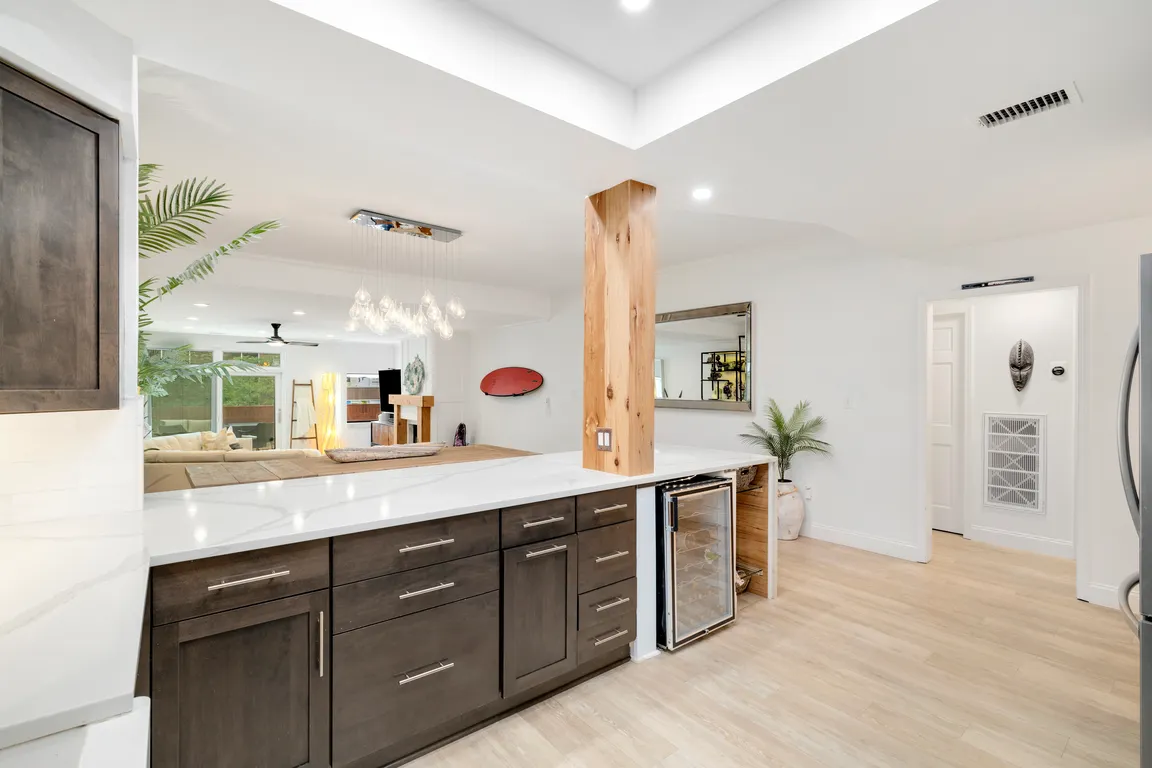 - Description: Designed For Entertaining With An Open Layout, Oversized Island, Updated Appliances, Sleek Cabinetry, Beverage Fridge, And Bar Seating.