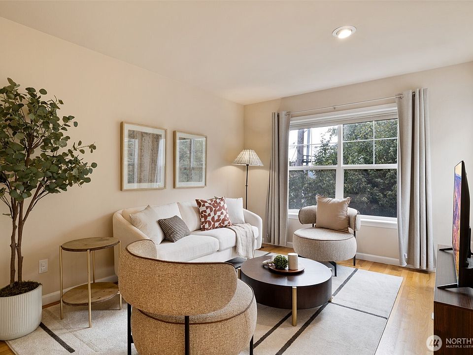 Delight in this contemporary townhome teeming with luxury updates including hardwoods, skylights, vaulted ceilings. Open & bright main level w/well-appointed kitchen boasting an eat-in bar, granite counters, gas range, tile backsplash & pantry; all open to the sprawling living/dining areas & balcony. 3 beds, all w/own baths including a spacious master w/walk-in closet & soaking tub. Private yard with new fencing and patio. Nearby all of Ballard’s amenities; Nearby public transit to Seattle downtown; Walkscore: 98 BikeScore: 96!