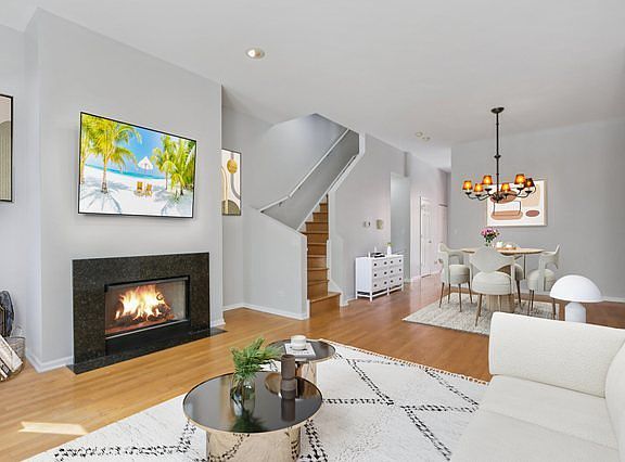 Beautifully updated University Village townhome private gated entry. The main level features an open-concept living and dining room with hardwood floors, a cozy fireplace and floor-to-ceiling windows that let in tons of natural light. The spacious kitchen offers stainless steel appliances, granite countertops, a pantry closet and direct access to a private balcony-perfect for morning coffee or grilling. A convenient half bath completes the main floor. Upstairs, the primary suite boasts dual closets, a ceiling fan, and a private bath with dual vanity and soaking tub. The second bedroom is generously sized and complemented by an updated hall bath with a walk-in shower. Laundry is also conveniently on the second level. The lower level offers a versatile family room, ideal for extra living space, a home office, or easy conversion to a third bedroom. Enjoy breathtaking skyline views from the private rooftop deck, perfect for entertaining or relaxing. Attached 2-car garage and freshly painted (8/2025). Improvements include new AC and boiler (11/2020), fully renovated bathrooms with new Kohler bathtub, walk-in shower, wall cabinets, sinks, and vanity cabinets (2/2024). Conveniently located just blocks from 90/94, Halsted Street Metra, and local bus routes.