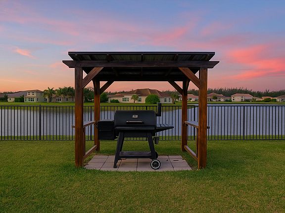 THIS IS THE ONE YOU'VE BEEN LOOKING FOR!!!! Rarely available, this waterfront 3 bed/2.5 bath home with two car garage is move in ready. The eat in white kitchen is gorgeous with premium GE appliances (including double oven) and opens into the family room. Other upgrades include French door style Refrigerator, Farmhouse sink, Double Oven, Quartz countertops throughout, Hurricane windows/doors, Screened Lanai, Fully Fenced yard, and Gazebo. This home offers a wide water view visible from multiple rooms and open floor plan! Westlake offers resort style amenities including amazing lagoon pool with waterslide, fitness center, fitness trail clubhouse, dog park, playground, splash pad and poolside concession, BMX pump park, and bocce ball courts. Low HOA and Top Rated Schools. Start living the coveted Westlake lifestyle today.