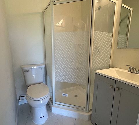 Newly built efficiency for rent with private entrance, A/C unit, private bathroom, and kitchenette w/ storage.