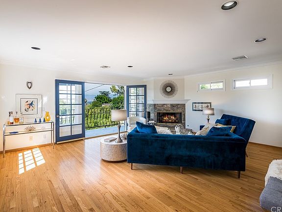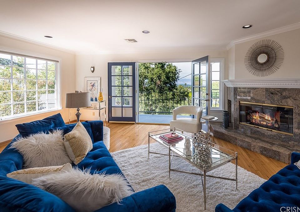Beautiful 4 bed, 4.5 bath view home located South of the Blvd in the hills of Sherman Oaks. Behind the private gate and through the double door entry, you will find a light-filled home with flawless open floor plan and great energy. The living spaces offer an abundance of windows, and are graced with rich, wood flooring. The formal living room features a skylight and French doors leading to the back patio, perfect for entertaining. The updated kitchen has quartz countertops, stainless steel appliances, and an eye-catching glass backsplash. The kitchen also features a convenient built-in banquette and flows directly in the dining room. The main floor offers two bedrooms; one with vaulted beamed ceilings with skylights, fireplace, and its own bath. The second is perfect for an office space and has French doors to the backyard and its own full bath. Step up to the family room which has a lovely balcony with valley views, crown molding, and a gorgeous fireplace. Upstairs you will find the two additional bedrooms, each with their own bathroom. The grand master suite has vaulted beamed ceilings, elegant fireplace, abundant closet space, and a balcony with sweeping valley views. The bath has marble floors and counters, dual sink vanity, spa tub, spacious walk-in shower, and skylight. The backyard offers a multi-level terraced patio with built-in BBQ and more stunning valley views. You do not want to miss out on this amazing home!