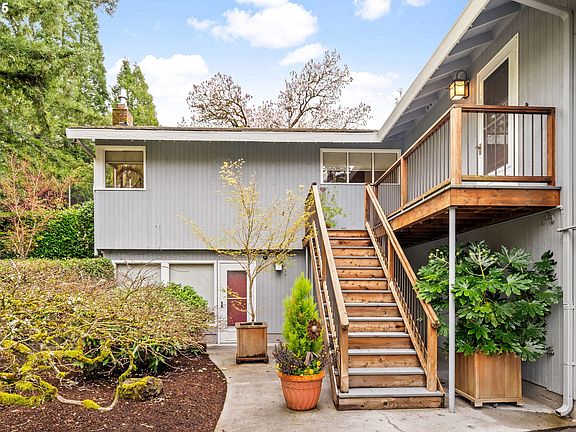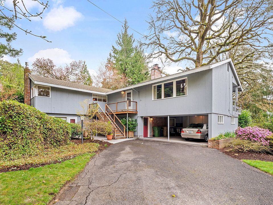 Welcome to this delightful Mid-Century home with daylight basement, nestled on a spacious 1/3 acre lot in the serene community of Lake Oswego. Built in 1954, this 4-bedroom, 2-bathroom residence offers a unique blend of vintage charm and modern potential. As you ascend the exterior flight of stairs, you'll enter the main level, where the living room welcomes you with vaulted ceilings, exposed beams and a cozy fireplace, exuding mid-century modern vibes. This level also includes the primary bedroom with an attached bathroom, along with two additional bedrooms. The kitchen/dining area features another fireplace, adding to the home's warm and inviting atmosphere. Step out onto the covered deck off the living room and kitchen to enjoy peaceful moments surrounded by nature. The daylight basement provides additional living space, including the 4th bedroom, bathroom, a spacious laundry/utility room with workshop space and family room, perfect for guests or extended family. Additionally, the carport area provides ample storage with multiple built-ins. Located in a vibrant community, there is easy access to freeways, parks, a variety of shopping, delicious restaurants, and four Lake Oswego Easements to choose from. This charming property is ready for your personal touch to bring it to its full potential. Don't miss the opportunity to make this beautiful home your own!