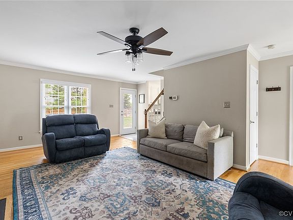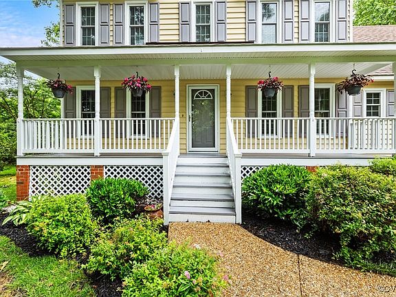 Stunning Two-Story Home in Sought-After St. James Woods! Welcome to this beautifully updated 4-bedroom, 2.5-bath home located in the highly walkable & conveniently located St. James Woods community, just minutes from Route 288 & Powhite Pkwy. With exceptional curb appeal, a full front porch, fresh landscaping & a direct-entry one-car garage, this home is the perfect blend of comfort, charm, and functionality. Step inside to an expansive family room featuring gleaming hardwood floors & elegant crown molding which flows effortlessly into the kitchen making it ideal for gathering with friends and family. The updated, well-appointed kitchen boasts SS appliances (including a brand-new stove, microwave, and dishwasher in '25), bar seating and abundant amount of counter & cabinet space all overlooking a bright and airy breakfast nook-perfect for morning coffee w serene backyard views. The formal dining room is great for hosting dinner parties with hardwood floors, crown molding, and chair rail detailing. It also makes a great kid hang out spot with designated place for crafts & toys. The first level also features convenient access to the garage, a laundry room w built-in cabinetry as well as powder room. Upstairs, retreat to your luxurious primary suite, complete with a large walk-in closet & totally redone spa-inspired en suite bath featuring plank tile floors, an oversized vanity, custom-tiled walk-in shower w glass sliding doors & a skylight for added natural light. Three additional generously sized bedrooms share a well-appointed hall bath w tub/shower combo. Outside, enjoy the expansive, two-tier rear deck overlooking a sprawling, fenced backyard and dedicated play area—perfect for relaxing in your private oasis. Additional notable updates include: encapsulated crawl space (2023), bathroom remodel & kitchen refresh (2023), installed Pella windows (2019), gas furnace & HVAC unit (2018), new water heater (2024), new kitchen appliances (2025) and new roof (2010). Additional storage is available in the pull-down attic!
