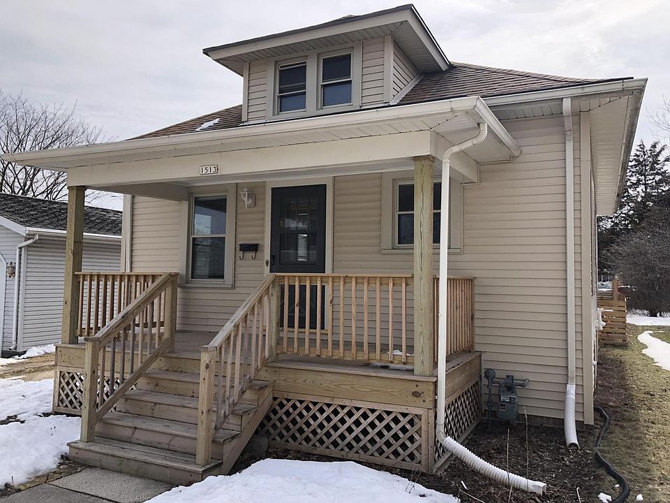 Great character with original Hardwood floors and natural woodwork!,(Both recently refinshed) Even some glass doorknobs. Newer front porch, enter through a nice door w/leaded glass to the large living room which is open to the dining room. The full bath has been recently redone as well. The kitchen is roomy + features large natural cabinets. The two bedrooms have the same refinished hardwood, 1 has a closet. New fence in 2020, + all the windows have been replaced. The vinyl siding is newer + in good condition. The upstairs project has been started + could be a third bedroom. The plumbing is in for a half bath, electrical is partially in, insulation is in. Framing is complete as well. Potential great living space! There is a 2 car detached garage + landscaping is completed w/wildflowers!
