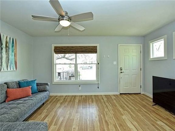 Located south of downtown Austin, the duplex features a multi-level floor plan where the living, dining, kitchen and half bath are upstairs and both bedrooms and the full bathroom are located downstairs.