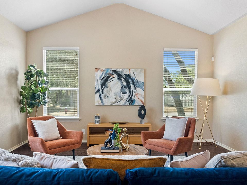 Welcome to this charming, move-in-ready, cottage-style home on a desirable corner lot in Turtle Creek Village. A welcoming front veranda sets the tone, leading into a bright, open kitchen and living area that’s perfect for everyday living and entertaining. Plus a low tax rate! The primary suite is conveniently located downstairs and features dual vanities, a soaking tub, a separate shower, and a generous walk-in closet. A separate laundry room on the main floor adds to the easy, functional layout. Upstairs, a versatile flex space makes an ideal game room, loft, or home office, along with two additional bedrooms and a full bath. Step outside to a peaceful backyard with a covered patio, mature oak trees, and a fully fenced yard—perfect for relaxing or hosting friends. The detached garage offers flexible use as a studio, an office, or a workshop. Recent updates include fresh interior paint throughout, giving the home a bright, move-in-ready feel. Turtle Creek Village residents enjoy a range of community amenities, including a swimming pool, clubhouse, playground, and walking trails. With quick access to I-35, SH-45, shopping, dining, and parks, this home delivers comfort, convenience, and an excellent Round Rock location. Don’t miss this one!
