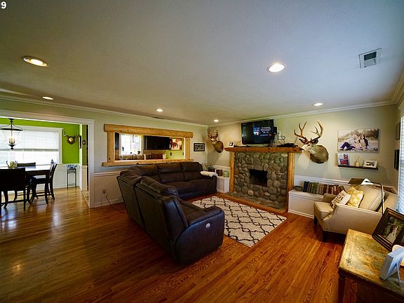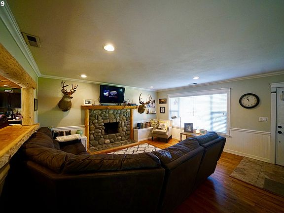 Like NEW customly renovated ranch home walking distance from National Shop Centers, Schools & Lake. The fully fenced meticulously landscaped backyard entails a unique paver patio with a circular firepit, pergola & 870 sq/ft of shop, outbuildings & the attached garage. New roof, siding, windows, Crown Molding, Tongue & Groove, & bathrooms. Wainscoted formal dining room, hardwood & tile flooring, river rock firplace. An absolute delight!