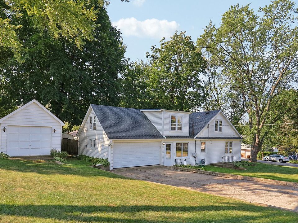 A stones throw from all Downtown Mchenry has to offer. Discover the charm of this 1950 corner lot home, where timeless character meets modern updates. Step inside and be welcomed by graceful archways, built-ins, and a bright living room that flows into the updated kitchen with stainless steel appliances. Just beyond, the family room offers a cozy gathering space with direct access to the attached 2-car garage and outdoor patio. Two bedrooms and a full bath are conveniently located on the main floor. Upstairs, the entire second level is dedicated to the primary bedroom, complete with a large finished attic space and its own bathroom. Both bathrooms in this home have been beautifully updated, blending style and function. A partially finished basement provides extra flexibility, while the detached 1-car garage adds even more storage or hobby space. Set on a corner lot with mature trees, this home offers a peaceful neighborhood feel just minutes from town, shops, and conveniences. Roof, vinyl siding and gutters less than 10 years old.