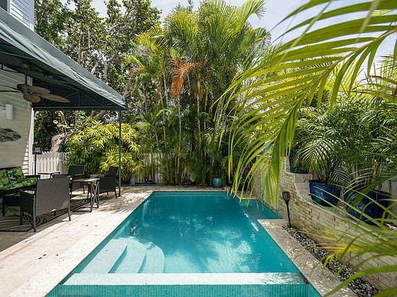 In the Meadows & marvelous! This stunning 2BR/2.5 furnished home is the epitome of Key West living. Chef's kitchen, large living/dining area, and private heated swimming pool with spa make this home ideal for entertaining guests. The home offers an abundance of elegance with coffered ceilings, travertine and wood floors, wood shutters, stunning built-ins, and more. In the kitchen, there is an abundance of cabinet storage and counter space, double ovens, a gas range, as well as a home office nook. The living area has a built-in bar area and media center. In addition to the sitting area and private balcony, the primary master suite also has an attached bath with soaking tub and shower. The primary suite is equipped with a large closet and dressing area. The secondary bedroom is private and offers a walk-in closet and full en suite bath. Laundry is located on the second floor. Home was built in 2008 and has impact windows and doors, whole house generator, and private gated covered parking. Home is in a Condo with 7 other units, but truly lives like a single family home. Enjoy your morning coffee on the classic front porch surrounded by tropical landscape and white picket fence. Poolside is perfection for dining al fresco or relaxing between dips! This home is a stunner and centrally located in Key West near Old Town, shopping, dining, marinas and more!