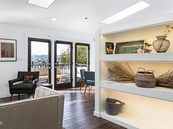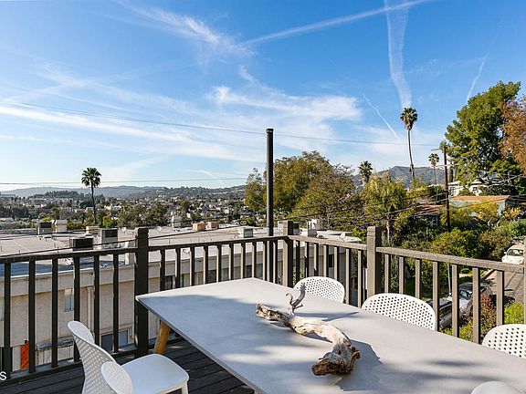 Perched high above the street in LA's desirable Franklin Hills enclave, this modern and stylish home offers panoramic west-facing city, evening-light, and sunset views that impress by day and dazzle by night. Ideal for outdoor dining and entertaining, a top-level wraparound deck enhances the home's indoor/outdoor vibe and is warmed by a see-through fireplace shared with the living room, making it comfortable every season of the year. The main floor is distinguished by an open-concept ambiance that is amplified by high ceilings, skylights, illuminated built-ins, and French doors opening to views and the top deck. The fireplace-warmed living room flows effortlessly to the dining room and a custom designer kitchen with stainless steel appliances, granite countertops, a colorful mosaic-tile backsplash, and metal cabinets with glass uppers. Approximately 1,428 square feet, the floorplan reveals three bedrooms and three bathrooms, including an en suite primary bedroom and a secondary bedroom on the main floor. Both bedrooms open to a private backyard. Downstairs awaits another deck and versatile room with a separate entrance, a full bath with jetted tub, and a laundry closet, creating a great space for a guest bedroom, a family room, a studio, or an office. Enjoy the added convenience of a solar power system and a one-car garage. The home's location is outstanding. The trendy shopping and dining of Silver Lake, Los Feliz, and Echo Park are just minutes from home.