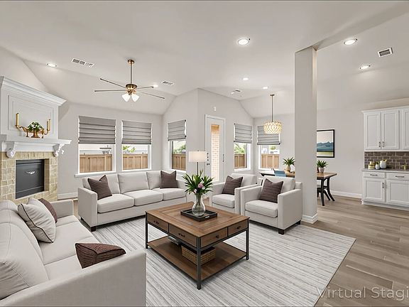 The open-concept living area centers around a stone fireplace and flows seamlessly into the kitchen and dining spaces. The kitchen includes an island, gas cooktop, wall oven, walk-in pantry, and sleek backsplash—all framed by generous natural light for an inviting, warm ambiance.