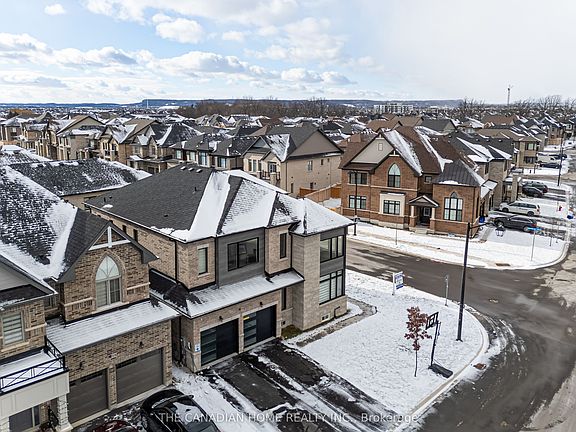 Welcome to an exceptional, upgrade-packed residence in Milton, where modern elegance meets everyday comfort. Set on a premium corner Lot fronting onto serene natural view of Ravine & a Pond, this home offers a striking modern elevation and over $250K in curated upgrades. Over 4500 square feet of living space. Step inside to soaring 10-feet main-floor ceilings, solid Superior Red Oak hardwood, upgraded 8-feet doors and rich architectural details including a coffered dining ceiling and waffle ceiling in the living room. The open yet functional layout features separate living and dining spaces, a bright family room with a cozy natural gas fireplace and a chef-inspired kitchen with silky white quartz counters and backsplash, gas stove, premium black stainless steel Samsung Bespoke appliances and a separate gas line ready for BBQs outdoors. Smart-home conveniences include motorized blinds, a full security/smart system, central vac rough-in, and 200-amp service with EV wiring and charger in the garage. A unique Den/Office with 20 Feet ceiling overlooking the Ravine & a Pond. Upstairs on the second floor, enjoy 9-feet ceilings, four spacious bedrooms 3 walk-in closets and 1 double door closet, a luxurious primary retreat with a spa-style 5-pc ensuite and oversized walk-in closet, plus an upper-level laundry room for ultimate convenience. The finished basement with separate side entrance and full washroom offers incredible flexibility, ideal for an in-law suite or future legal rental conversion. No side walk, which allow extra cars to be parked on the driveway. Minutes to parks, trails, shopping, and highly regarded schools such as Tiger Jeet Singh Public School, Hawthorne Village Public School, St. Bernadette CES, and Craig Kielburger SS, this home delivers refined living in a prime family neighborhood. Minutes away from 407, 401, & Oakville.