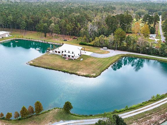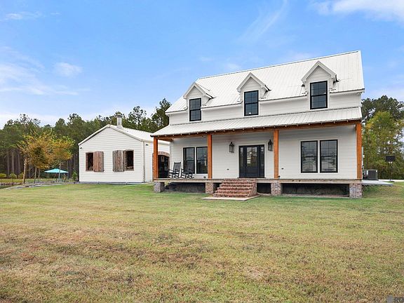 Rare find in Ascension, offering nearly 6 acres of your very own paradise. Built in 2021, this beautiful farmhouse features expansive front and rear porches perfect for relaxation. As you enter, you'll be greeted by grand high ceilings, abundant natural light, and a cozy large brick fireplace that adds charm to the open concept living area. The functional kitchen is a chef’s dream, equipped with a gas stove, a convenient pot filler, a full slab island, and a walk-in pantry with counter space and custom shelving. The lower level also includes a convenient half bath, a primary suite and a laundry room with direct access to the elegant primary bathroom. This spa-like retreat boasts a large jacuzzi tub, a custom walk-in shower, and a double sink vanity. Upstairs, the wooden staircase leads to a spacious loft, two additional bedrooms, and a well-appointed full bath that includes a generous vanity and custom tile tub surround. But the real highlight is the unique outdoor living space accessed through the bricked courtyard, perfect for entertaining or relaxing with the family. This exceptional space features a full kitchen equipped with a gas stove, microwave, commercial size drink cooler, full refrigerator, and wine cooler. The inviting space also includes a cozy wood-burning fireplace, bar seating for casual dining, and a convenient full bath. Accessible through large barn doors, you'll find a spacious concrete patio and deck, perfect for sunbathing or enjoying a peaceful fishing experience. The attached workshop is a true gem, showcasing remarkable character and functionality. Inside, the shop is thoughtfully built out with several storage closets, overhead storage lofts, a dedicated workout area, and a workstation complete with a pegboard wall and workbench. With two metal roll-down doors on each side, this workshop provides easy access and ample space for all your projects and hobbies. It's an ideal blend of practicality and charm, making it a standout!