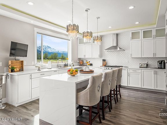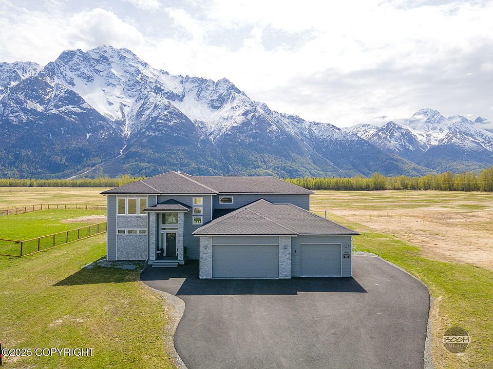 STUNNING Newer Construction Home w/ RV Parking and Jaw Dropping Mountain Views. Spacious 2981 Square Feet with 5 Bedrooms, 3.5 Baths & a 3 Car Garage. Featuring a Main Level Primary Suite w/ Electric Fireplace and a Luxurious Bathroom. Amazing Natural Light and Views of Pioneer Peak Pour Through The 2-Story Wall Of Windows in Great Room. Furniture Available For Purchase on Separate Bill of SaleNoteworthy Features: -Welcoming Entry: Step inside to an expansive open-concept layout, instantly drawing your eyes to the breathtaking views of Pioneer Peak. -Chef's Kitchen: Designed for entertaining, this gourmet kitchen features a butler's pantry, an extra refrigerator, premium cabinetry with pull-out shelving, and high-end finishes throughout. -Primary Suite: Located on the main floor, the luxurious primary bedroom is enhanced with a coffered ceiling accented with lighting, a chandelier, and an electric fireplace for added warmth and charm. -Spa-Inspired Ensuite: Unwind in the elegant bathroom featuring a deep soaking tub, custom tile details, and a serene spa-like feel. -Great Room: Towering ceilings, a cozy gas fireplace, and uninterrupted views of Pioneer Peak make the living room the true centerpiece of the home. Additional Features: -Catwalk & Laundry: Upstairs, a catwalk overlooks the living space, connecting four bedrooms (two at each end) along with an upstairs laundry area equipped with a utility sink for convenience. -Custom Touches: Upgrades include top-down/bottom-up blinds with remote controls (on the first floor and one upstairs bedroom), providing convenience, privacy, and summer light control. -Outdoor Living: The back deck and hottub invite you to enjoy Alaskan beauty right out your back door. A paved RV / Boat parking pad with electrical hook-up adds convenience and functionality for outdoor enthusiasts. -Flooring: Tile in bathrooms and laundry areas combined with durable luxury vinyl plank flooring on the main level for a balance of elegance and practicality. -Refined Finishes: Quartz countertops elevate both kitchen and bathrooms with timeless sophistication. -Storage Solutions: Generous closet space ensures organization throughout the home. -Prime Location: Ideally situated for commuters while offering quick access to outdoor adventures such as hiking, fishing, and ATV trails. Pyrah's Pioneer Peak Farm is just 2 mins away or a short walk or bike ride for organic fresh fruit and vegetables. The Butte hiking trailhead is only 5 minutes away. - Better Than Brand New. This property is in pristine like-new condition complete with all appliances, blinds, and landscaping which many new construction homes do not include. It's the perfect combination of luxury and comfort with stunning mountain views. Don't miss your chance to own a rare Alaskan retreat with unmatched access to both relaxation and recreation.