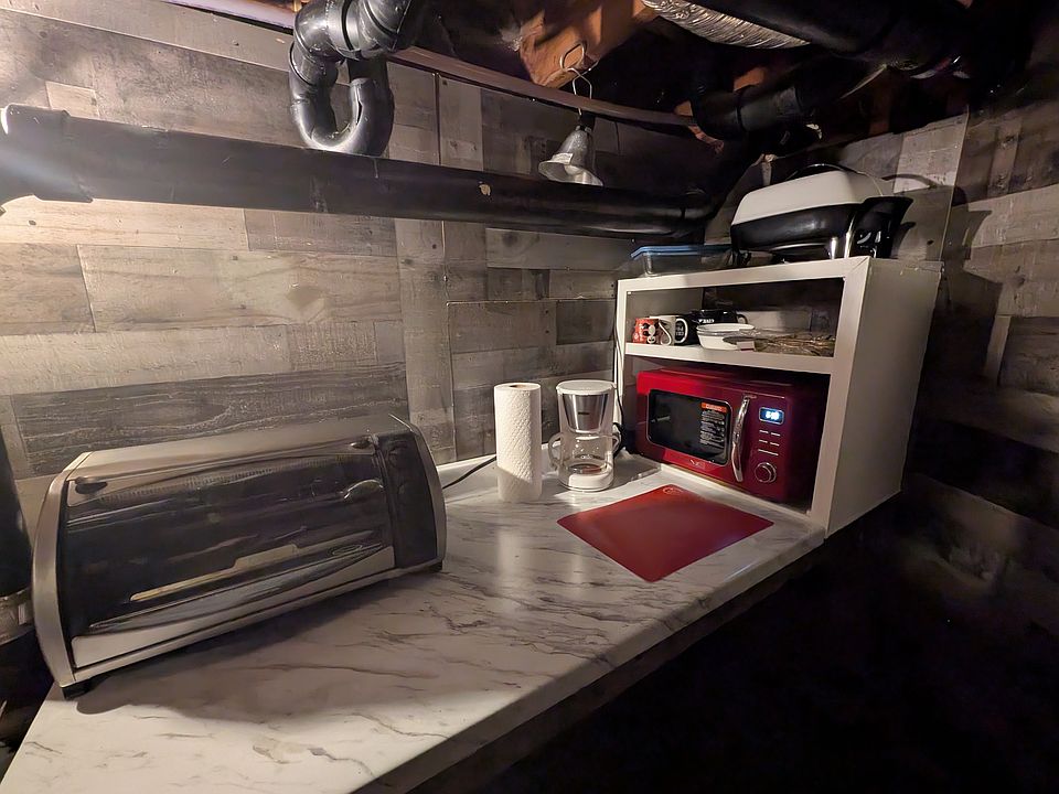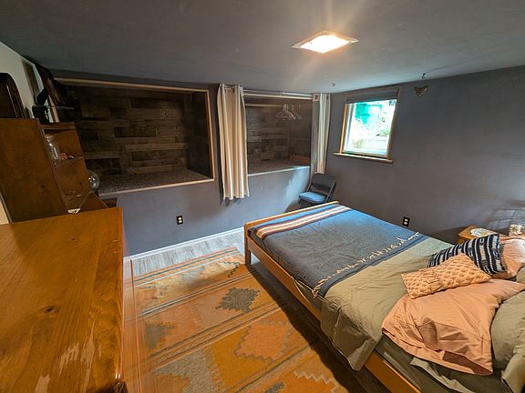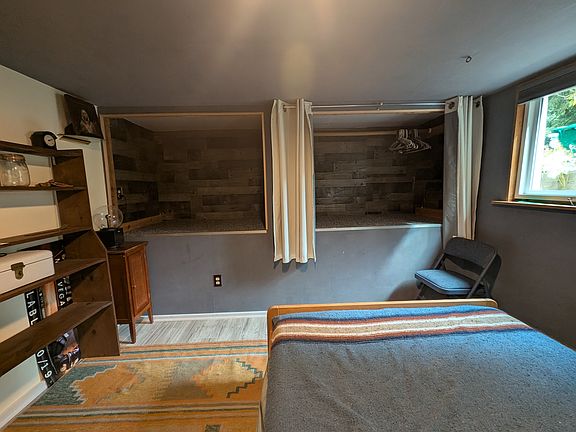 Fully furnished cozy private basement bedroom with small kitchenette (sink, retro fridge and microwave, toaster oven and coffee maker) with attached sitting area. Rental space is approx. 350 square feet with laminate flooring and area rugs. Detached, semi-private bathroom with sink, shower and toilet. Blackout windows in bedroom, full sized bed, dresser, bookcase, closet to hang clothes, cubby to store belongings, and bedside table with lamp. Baseboard heating in bedroom and gas-forced air in sitting area. Access to internet/Wi-Fi, laundry facilities, two semi-covered patios, gardens and water feature. Free parking. Bus stop less than 100 feet from house (route 21) main lines are 2-3 blocks walking distance. Grocery stores, restaurants and bakeries within walking distance.