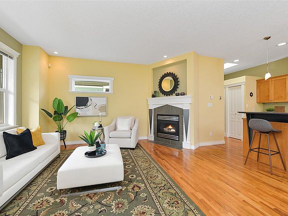 Open concept layoutGourmet kitchenCozy gas fireplaceStunning hardwood floorsWood-trimmed windowsStained glass accentsLush front yard