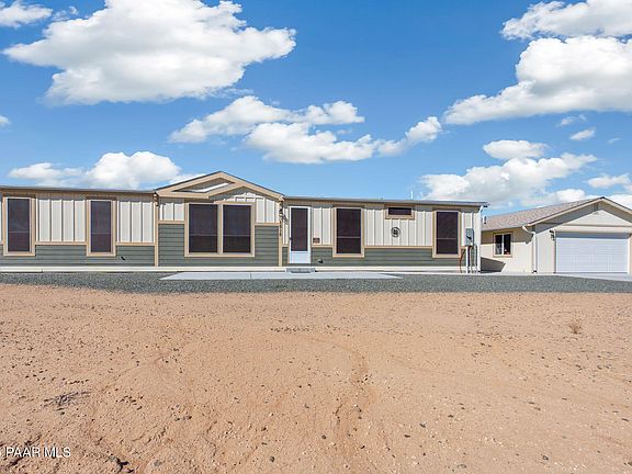 Welcome to this beautiful 2023 manufactured home located in the desirable Del Sol North subdivision of Chino Valley. Set on a fully usable, flat 1-acre lot, this property offers incredible mountain views, abundant natural light, and a peaceful setting that perfectly blends modern comfort with rural charm. Inside, you'll find an open-concept layout featuring both a spacious living room and a separate family room-ideal for entertaining or creating distinct living space. the kitchen is a true centerpiece with a large island, ample cabinetry, and seamless flow into the dining and living areas. A split floor plan provides privacy, with a generously sized primary suite on one side and additional bedrooms and a full bathroom on the other.Outdoors, the possibilities are endless. The home is equipped with an owned solar system for energy efficiency, and a 24x24 detached garage offers plenty of space for vehicles, storage, or a workshop. The entire property is perimeter fenced, making it perfect for pets, gardening, or simply enjoying the open space. With panoramic views of the surrounding mountains and the quiet atmosphere of Del Sol North, you'll feel a world away while still being conveniently close to local amenities. This turnkey property is ready for you to move in and enjoy everything Northern Arizona living has to offer.