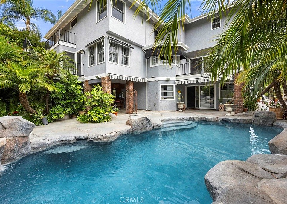 Just in time for Summer, escape the heat and relax in your newly re-plastered pool with rock accents and waterfall. Come fall in love with this lush location and getaway from the bustle of the city, yet still enjoy the close proximity to near by shops and restaurants. Built to accommodate any size family, this home offers ample privacy and space. This rare to market find features a generous floor plan situated over three levels. Each of this homes 6 bedrooms are equipped with access to its own ensuite. Stepping into the foyer one is greeted by double-height ceilings and large windows that fill the area with natural light. Formal dining exudes an ambiance of refined sophistication with wet bar and buffet. The family kitchen sets the stage for gracious entertaining; featuring newer stove top, upgraded granite counter tops, center island, 2 sinks, breakfast bar, walk in pantry, dishwasher, newer oven and eat in kitchen. Unique offerings provide a formal living area and two large family rooms; all three with cozy fireplaces. Appointed on 1.76 acre lot this estate affords room to build and has abundant avocado and fruit trees. Centrally located between Los Angeles and Orange County, with minutes to a world premier private golf club, this luxurious forever home is ready for its new owners to customize it to their own style and tastes.