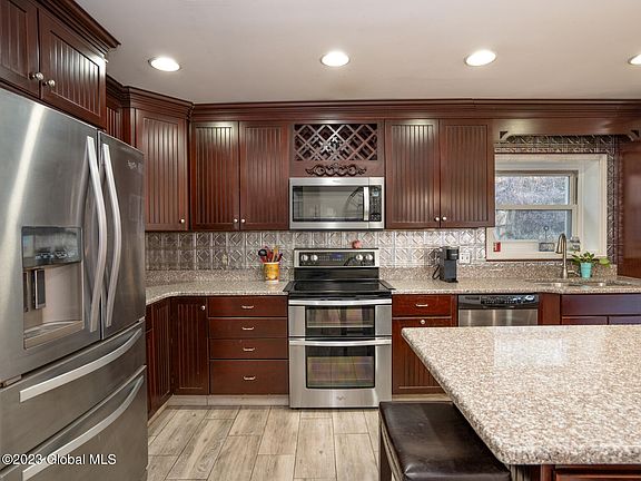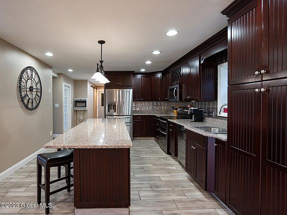 Custom Colonial that has been completely updated from the opening of the main wall that now exposes the 19 x 25' living room and open concept dining area that will hold your largest table....kitchen updated with cherry cabinets and 9 x 3 center isle with seating for 6. Granite countertops & stainless appliances. Just steps off the kitchen is a pantry/dry bar area. First floor bath updated with custom tile/walk in shower. CA Closets in upstairs bedrooms. Lv room/fm room both have propane stoves for those cold winter nights. Spiral staircase to upstairs with 3 large bedrooms & 2 full custom baths.Lovely front porch & patio to enjoy all summer long. If it gets too hot, jump in your in-ground pool. Easy commute to Greenbush, Albany or Hudson