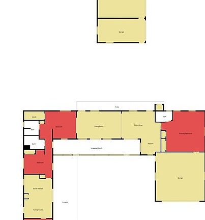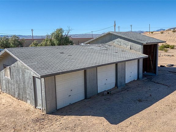 Situated on a sprawling one-acre lot, this exceptional property is perfect for multi-family or multi-generational living. The main living area boasts a spacious primary bedroom with a walk in closet, a large living room, and a well-equipped kitchen. Seamlessly connected is an additional living space with two bedrooms and its own kitchen, ideal for extended family or guests. Alongside the attached two-car, boat-deep garage, the property features a large detached three-car bay garage and an extra-tall bay, perfect for RVs or larger equipment. This vast property provides ample parking for all your toys and features electric power to all buildings. Convenience is key, as the home is ideally located just moments away from the Mohave Crossings shopping center and other amenities. A private well ensures a reliable water supply, adding peace of mind. This property has incredible potential and endless opportunity for investment. The floor plan could be split for rental income, automotive shops, horses and livestock or incorporate it into one single family home. Great property with many creative possibilities! This is a must-see!
