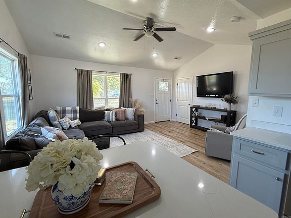 Welcome to this beautiful 3-bedroom, 2-bath home built in 2023, perfectly situated on .96 of an acre with fenced backyard--ideal for pets, kids or outdoor entertaining. Step inside to a bright, open layout featuring vaulted ceiling in the living area and a kitchen/dining combo with convenient breakfast bar. Large windows fill the home with natural sunlight, creating a warm and inviting feel throughout. Enjoy morning coffee or evening sunsets from the covered front and back porches. The home also includes separate laundry room, a 1-car garage, and ample extra parking space for guests, RVs, or boats. This modern home offers the perfect blend of comfort, function, and outdoor space-all just waiting for you to make it your own!