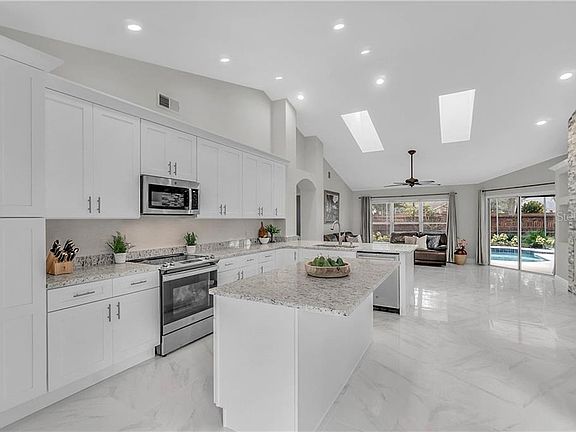 This highly-updated Oviedo home is ideally-located and ready for a new owner! As you approach the home, be sure to turn and take in the serene, water view. Imagine having this view every time you return home or look out the front window! Inside, your eyes will immediately be drawn to the gorgeous new kitchen (2020). It has been upgraded with new 42" CABINETS, GRANITE COUNTERTOPS, an ISLAND, recessed lighting, and STAINLESS STEEL GE APPLIANCES. The main living areas boast gorgeous views of the POOL, with decorative fountain and tropical landscaping. The floors in the main living area are luxurious PORCELAIN TILE FLOORS (2020). Other notable interior features include the double-sided FIREPLACE with floor-to-ceiling stone accents, new interior paint (2020), VAULTED CEILINGS, SPLIT FLOOR PLAN, built-in shelving, upgraded shared bathroom, and interior laundry room with storage. The owner's bedroom is truly a suite, with a WALK-IN CLOSET and reach-in closet, laminate wood floors, sliding doors to the pool, and vaulted ceiling. The ensuite bath has been upgraded with a new vanity with DUAL SINKS and granite countertops, GARDEN TUB with tile accents, a separate tile shower, and new fixtures. Outdoors, the pool with SCREENED LANAI is a Florida oasis. The deck is large enough for entertaining, and you can enjoy the benefit of NO REAR NEIGHBORS! The large CORNER LOT, allows enough space for multiple fruit-bearing trees, including mango, avocado, key lime, grapefruit, orange, tangerine, and pomegranate. The HOA includes tennis courts, a playground, and maintenance of the waterfront park across the street. Located just minutes away is UCF, highly-rated Oviedo schools, Twin Rivers Golf Course, Oviedo on the Park, and multiple shopping and dining options.