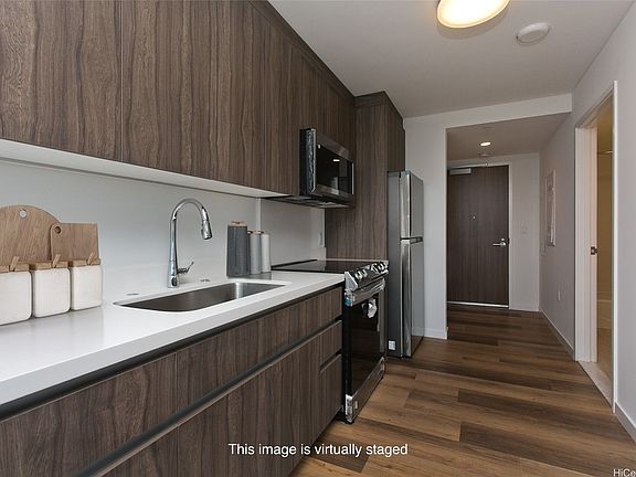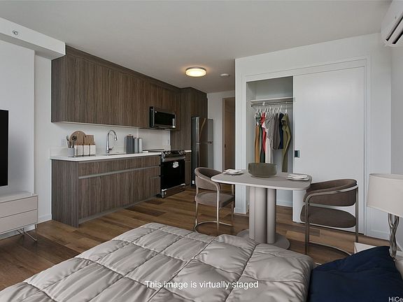 studio offers modern style and low-maintenance living, featuring floor-to-ceiling windows, split A/C, a private lanai, luxury vinyl flooring, quartz countertops, stainless steel appliances, and an in-unit washer and dryer included parking. Never occupied, this brand-new home is designed for comfort and elegance. Residents enjoy resort-style amenities including an infinity pool and spa with city and ocean views, BBQ pavilions, gym, yoga room, theatre, club lounges, sauna, and guest parking. Conveniently located minutes from Walmart, Sam’s Club, Target, and Ala Moana Center, with easy access to freeways, dining, and shopping.