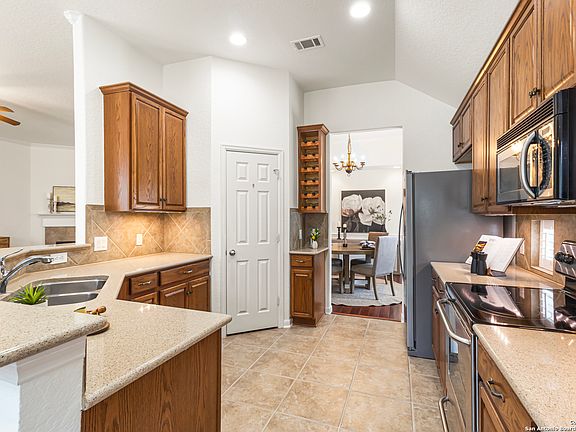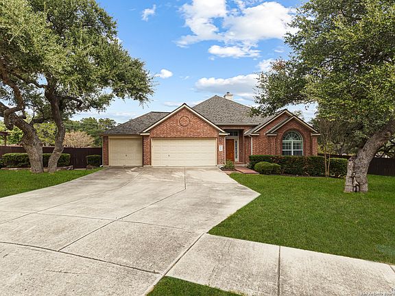 Meet the newest house in the exclusive gated community of The Crossing at Lookout Canyon. This home sits on .38 acres of land tucked away in a cul-de-sac making it the largest property in the neighborhood. Upon entry you are greeted by Patagonia hardwood floors which leads into a spacious open floor plan living area that opens to a formal dining area making it the perfect space to entertain. The kitchen overlooks the living space and features quartz countertops, tile backsplash, a built-in wine rack, and custom cabinetry with under mount lighting. A well-designed layout separates the master bedroom from the office and secondary bedrooms for ultimate privacy, while the details from the crown molding to plantation shutters in all major living areas makes this house stand out amongst the rest. The expansive backyard is the perfect space to add a pool and a sports court, and storage won't be a problem with your oversized three car garage. This property combines quiet, suburban living with close convenience to San Antonio amenities. Whether you're hosting guests or enjoying a quiet evening on the patio, you'll have the space and comfort you've been seeking. This is your chance to own a move-in ready home that delivers size, serenity and strong value in one of San Antonio's most desirable areas. Book your showing today!
