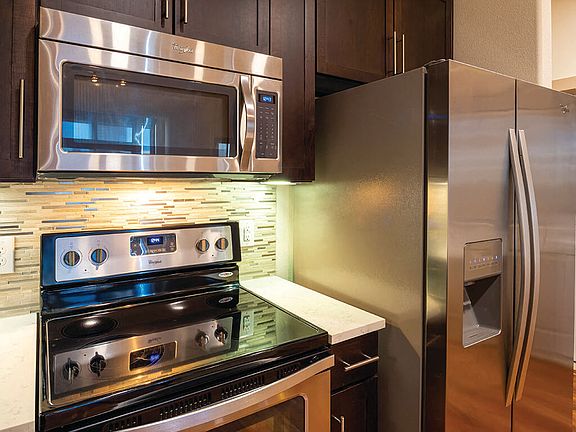 - Exterior features: Barbecue, Built-in beverage cooler, Business Center, Coat closet, Conference Room, Controlled entry access with dedicated parking, Courtyard, Designer carpeting in bedroom suites, EV charging stations, Easy access to METRORail station, Efficient Appliances, Extended 10-foot ceilings, Free Weights, High-speed Internet Ready, Kitchen food prep island, Kitchen island, Night Patrol, No Airbnb or nightly rentals, On-Site Maintenance, On-Site Management, Package Receiving, Polished quartz or granite kitchen countertops, Private massage room available for reservation, Stainless mosaic or linear travertine backsplash, Sundeck, TV Lounge, Walk-in shower