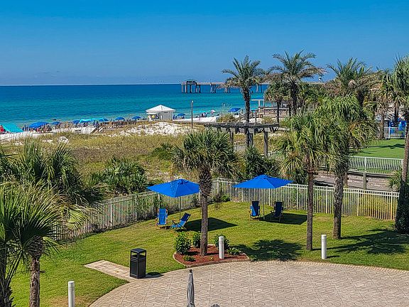 Welcome to one of the most beautiful condos with amazing views of the gulf, overlooking the gulf side pool areas. The balcony is open on both ends allowing expansive views where most balconies have walls on one or both sides. The condo is professionally decorated to perfection with a coastal vibe throughout. The unit is conveniently located on the same floor as the pedestrian bridge that takes you across Hwy 98 to all that Bayside has to offer. Also has COVERED PARKING garage with loads of space. The kitchen has gorgeous textured countertops that capture the look and feel of sand, sea, and surf... breakfast bar with seating & stainless steel appliances. Primary bedroom has tray ceiling with fan, king size bed, tile flooring throughout, plantation shutters, and private full bathroom. The bunk room has a TV and easy access to the shared bathroom. Washer/Dryer in unit. Unit accomodates 6 people with the sleeper sofa.