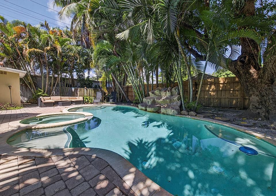 HIGHLY desired Poinsettia Heights neighborhood gem! Updated kitchen with granite counters, large pantry and snack counter facing the beautiful pool area. Primary suite offers renovated bathroom with walk-in shower and walk-in closet split from the other two bedrooms. Nicely updated guest bathroom has a tub and shower combination and large linen closet. Extra closet in the hallway. VERY good condition terrazo flooring throughout. Large heated pool with relaxing WATERFALL FEATURE and hot tub are in a VERY private backyard. Home offers a ton of natural light, a carport and a nice circular driveway made out of pavers. Ideal for a primary home, second home or short term rentals! No HOA. Close to the beach, downtown and 15 mins to the airport.