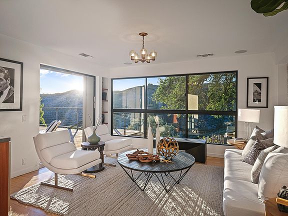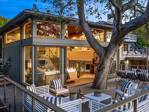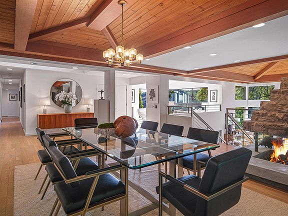 Designed for entertaining, this secluded home is also the perfect hideaway. Thoughtfully reimagined for the 21st century by noted architect Eva Sobesky, this residence in Pacific Palisades coveted upper Riviera neighborhood has retained its enduring mid-century modern appeal. With unobstructed views across Rustic Canyon, it can feel like you have the mountains all to yourself. The spacious, split-level design features open living spaces with soaring ceilings, white oak flooring, and brilliant walls of glass. Highlights include a modern chef's kitchen, stone fireplaces, a master suite with home office and oversized soaking tub, a library, a bar/lounge room, an outdoor jacuzzi, a custom built Swedish sauna, and a lofty great room that opens via giant sliding glass doors to an outdoor dining area, complete with a majestic Oak tree running through its center. Walking distance to the Sullivan Canyon hiking and biking trail, you can wave to your celebrity neighbors on the way. First time on the market in decades...take advantage of this rare opportunity!
