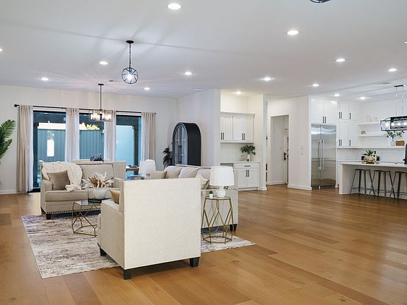 A grand open-concept floor plan welcomes you with soaring ceilings, abundant natural light, and seamless flow between living, dining, and entertaining spaces. The designer kitchen is a true showpiece—featuring a built-in refrigerator, professional-grade gas range, oversized island, quartz countertops, custom cabinetry, and premium finishes throughout. Perfectly designed for both everyday living and hosting, the main living area opens to the outdoors through expansive three-panel retractable sliding glass doors, blending interior comfort with resort-style outdoor living.