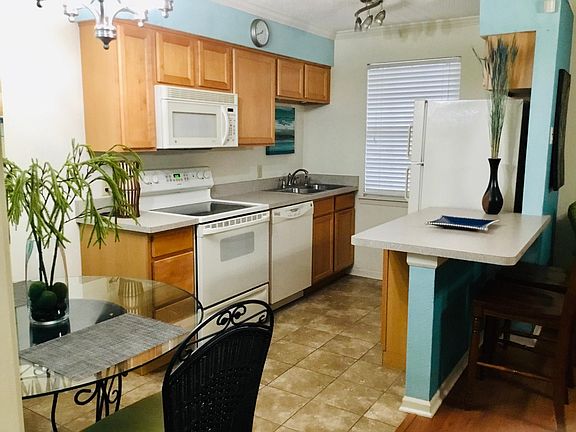 -Kitchen: Fridge, Microwave, Dishwasher, and Stovetop. Glass Kitchen Table w/ Iron base and 2 Chairs. Breakfast Island with 2 Counter Top Chairs. Also includes place setting for 4, Can Opener, Cookware and Utensils.