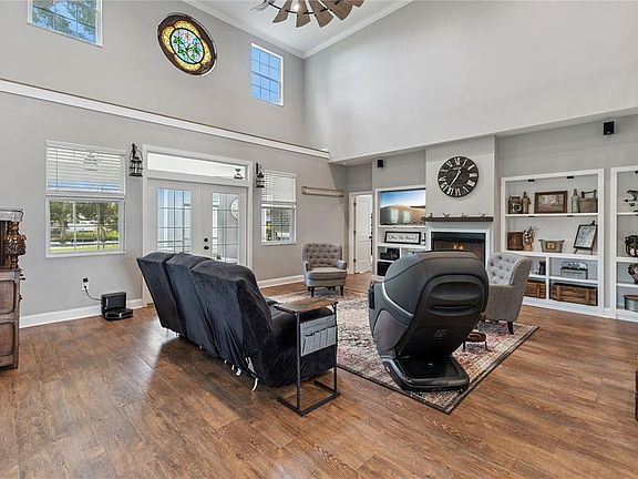 GORGEOUS PROPERTY ON LAKE HOWARD! Don’t miss this incredible opportunity for lakefront living in this 2024 Custom Built 4 BD/2.5 BA home presenting wonderful details such as open staircase, coffered ceiling in dining room and in the stately kitchen. Arrive at this residence at the circular driveway and step to the delightful front porch, then enter through stylish double doors into the magnificent living room. This impressive room showcases a soaring vaulted ceiling, sculptural staircase with iron spindles and wood railing; and fireplace flanked with built-ins that include shelves for entertainment components. The spacious living room seamlessly connects to the open design of the dining room and kitchen adorned with crown molding and a magnificent, coffered ceiling. The kitchen is outfitted with an abundance of light cabinetry, farmhouse sink, tile backsplash, stone countertops and stainless-steel appliances including gas range with decorative backsplash and exhaust fan. The spacious first floor owners’ suite has French doors to the covered lanai, a fireplace, built-in shelving and space for seating. A luxury bathroom provides a clawfoot tub, walk-in shower of glass and tile, dual sink vanity and a makeup vanity. The owners’ 20’x8’ walk-in closet offers organizers and a laundry area allowing stackable washer/dryer…so convenient! The three additional bedrooms and bathroom are on the second level along with a centralized bonus area. Crown molding, coffered ceiling and chandeliers bring an elegant flair to the home, while blending well with the urban country style of several barn door closures and luxury vinyl plank flooring throughout that gives comfort and durability. The first floor laundry room has a farmhouse sink and tiled pet tub/shower. The back side of the home offers another fireplace on the screen lanai overlooking the deep lot to a canal; within the backyard is a 30’x22’ steel building with 100 amp electric service; an additional bonus to this home is the full house Generac generator. The home has spectacular views of Lake Howard, but head down to your own lakefront paradise for a great day on the Chain of Lakes to enjoy boating, skiing, or simply to relax, rejuvenate and fish! OR walk over to Lake Howard Nature Park to enjoy the pet and child-friendly walking and biking trail. Lake Howard is a 622-acre lake that is part of the Winter Haven Southern Chain of Lakes; connected to Lake Cannon and to Lake May. Centrally located between both Florida’s coasts with easy access to Tampa and Orlando airports. This property is a rare gem, make it your forever home, schedule your private tour today!