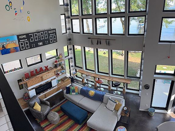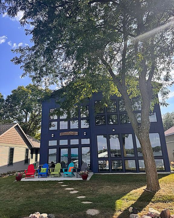 Welcome to West Lake Okoboji. The most beautiful place on earth! Nestled in the south shore of beautiful Miller’s Bay is this stunning lakefront home. The pinnacle of this masterpiece is the lakeside wall built entirely of windows, providing stunning views of the lake. This location experiences little wind making it ideal for early morning paddleboard or kayak excursions. Also, the house is far enough east of party cove so as not to be affected by party goers. The garage and main level floors are heated keeping things warm and cozy on those chilly fall days. The house is tastefully and whimsically decorated and sure to bring smiles to all visitors. The kitchen features a table that seats 10 and designed for easy conversation with friends and family. The dock is brand new (this year) and has a rail system which allows different attachments to be added. Two chairs, a table, and a paddleboard/wakeboard rack are included with the dock. Another beautiful feature is the suspended staircase built from timbers found right here in Wahpeton. The WOW factor this house provides is undeniable and it’s priced to sell.