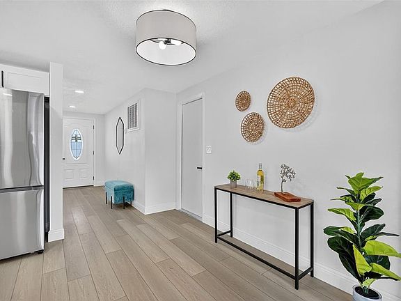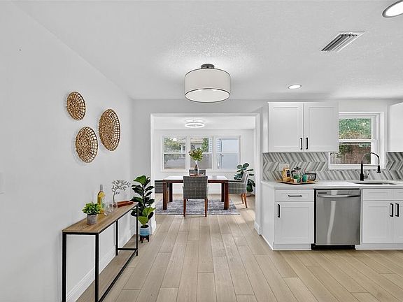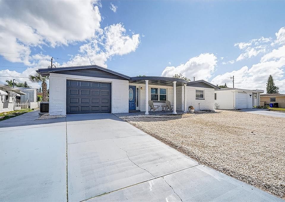 Beautifully Updated 2 Bedroom, 1.5 Bath Block Home in Holiday – New A/C, Roof (2022), No HOA, No Flood Zone This fully updated 2-bedroom, 1.5-bathroom block home with a 1-car garage offers comfort, style, and low-maintenance living in a quiet Holiday neighborhood. Featuring a new A/C system, roof from 2022, and newer insulated double-pane vinyl windows, this home is move-in ready and designed for easy Florida living. Inside, you'll find luxury vinyl tile flooring throughout, with tasteful porcelain tile in the full bathroom. The kitchen and bathrooms have been carefully renovated with real wood cabinets (plywood construction), soft-close doors, dovetail drawers, and quartz countertops. The kitchen stands out with a modern glass herringbone backsplash and brand-new stainless steel appliances, combining function and visual appeal. Additional highlights include fresh paint inside and out, a spacious Florida room that opens to a screened-in back patio, a welcoming front porch, and a low-maintenance rock yard. The double-wide driveway and sidewalk to the back porch offer convenience, while the large backyard shed provides extra storage. Located in a no HOA, no flood zone area, with easy access to Tampa, Pinellas County, shopping, entertainment, and the nearby beautiful Florida Gulf beaches, this home offers both flexibility and peace of mind—with no flood insurance required. Schedule your private showing today!