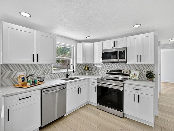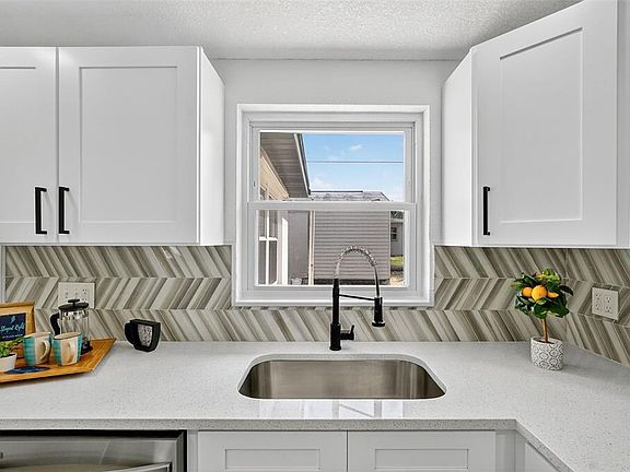 Quartz countertopsModern glass herringbone backsplashWelcoming front porchSpacious florida roomScreened-in back patioReal wood cabinetsDouble-wide driveway