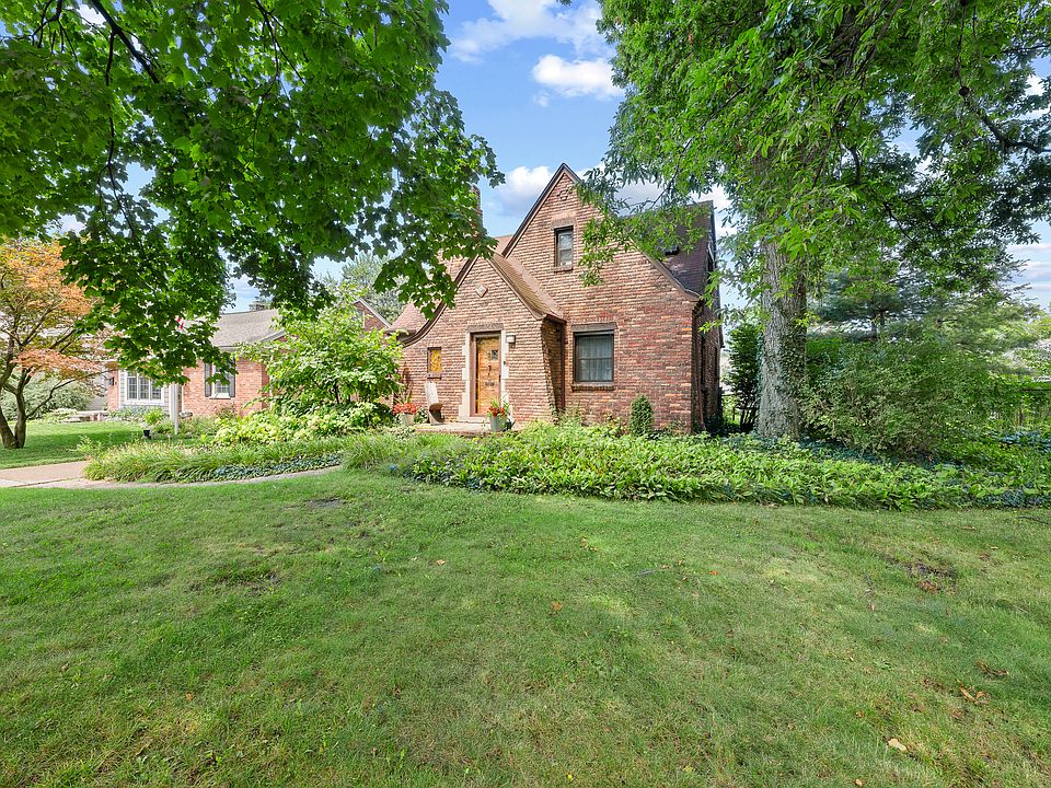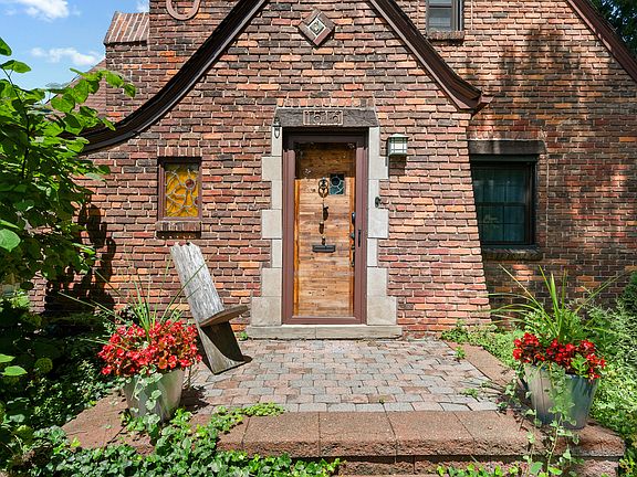 Brick fireplaceLarge backyardBeautiful landscapingOriginal hardwareCove ceilingsMarble countertopsHands-free faucet