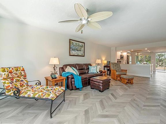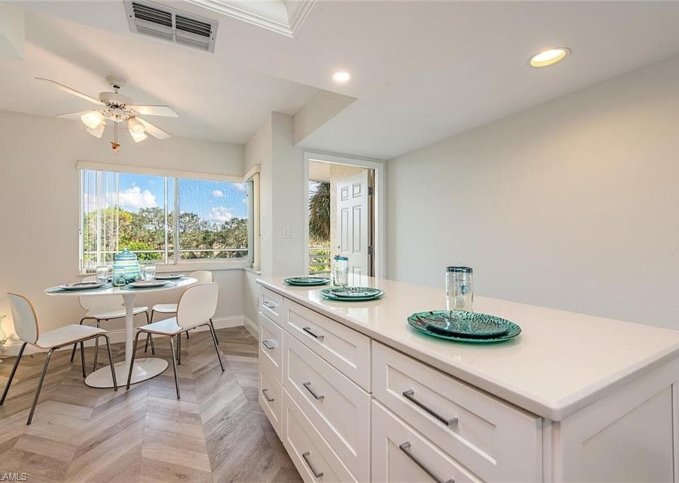 THIS GEM OF A UNIT IS CALLING YOU! This is a stunning NEWLY RENOVATED unit on the fourth floor that faces WESTERLY toward the GULF OF MEXICO and BAREFOOT BEACH, surrounding BAYS and mangrove-lined BOARDWALK. The unit did not sustain ANY damage from Hurricane Ian. IMPECCABLE DESIGN & DECOR was carefully implemented in all living areas featuring a new KITCHEN with QUARTZ countertops with LARGE ISLAND & pantry shelving. WHITE and LIGHT GRAYS were utilized in the DESIGN of this unit with the HERRINGBONE FLOORING seamlessly flowing through all living areas without interruptions. Both BATHROOMS feature their own DESIGNER touches. All windows/glass is hurricane PROTECTED with electric and roll down SHUTTERS that are easy to use. Enjoy the boardwalk, gazebo, clubhouse, satellite pool, & be close to nature like tortoises, fish, dolphin. Pickleball, tennis, bocce, swimming, hiking, kayaking and more! NORTH NAPLES location is the perfect spot for HIGH-END SHOPPING & DINING areas, and ability to access VANDERBILT BEACH, DELNOR WIGGINS STATE PARK BEACH, and BAREFOOT BEACH all in Collier County. PRIVATE-GATED ENTRY at a nominal entry price for North Naples beach location. BEST BUY in NAPLES WALK