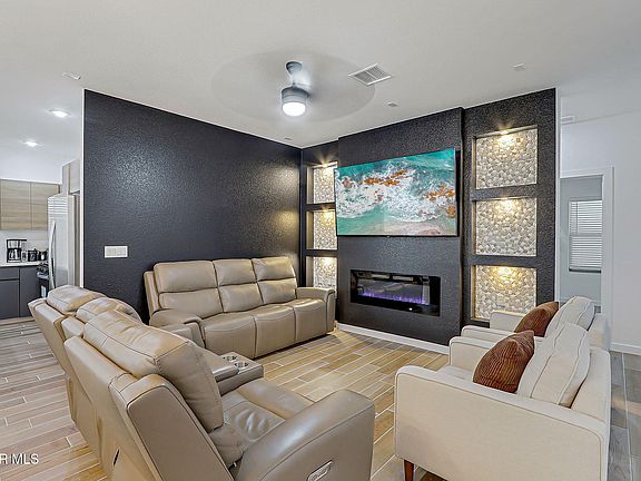 Modern styleCustom fireplaceBlack-finish ceiling fansPremium upgradesQuartz countersQuartz backsplashCorner lot