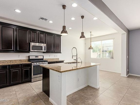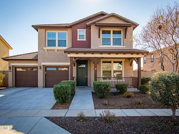 This beautiful home with a 3-car garage has amazing curb appeal with a quintessential front porch and a huge backyard with a covered patio. You'll find one bedroom and full bathroom downstairs, three additional bedrooms, and a loft upstairs. The spacious, open kitchen features a large island, gas stove, upgraded cabinets, granite countertops, and a pantry. It also has solar panels, reducing your electric cost to just an additional $225.00 per month. All of this is located in the amazing community of Marley Park, featuring two community pools & 15 unique parks connected by an Arbor Walk & within walking distance of schools.