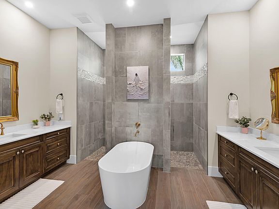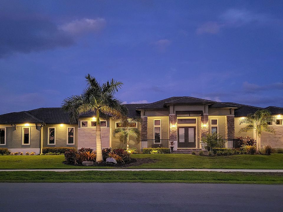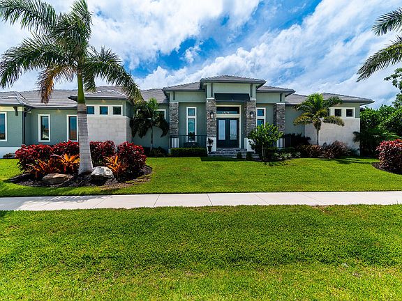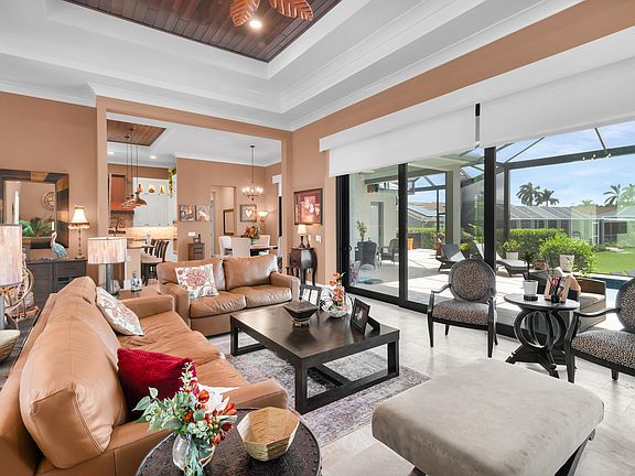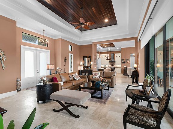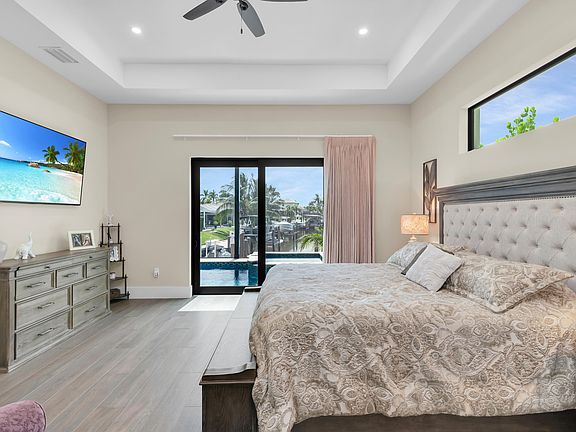 Welcome to this beautiful, spacious, newly built home on a massive waterfront, corner lot. The home was thoughtfully designed with hand chosen touches and Marco Island-inspired finishes. The house boasts 4 oversized bedrooms, 3.5 baths, and a large office. The great room features wall-to-wall, floor-to-ceiling glass pocket sliders open to a screen-enclosed lanai with expansive water views. 3 of the 4 bedrooms have direct access to the lanai with heated pool and hot tub! The owner made significant improvements during the build including the installation of a huge custom dock, premium, mature landscape package, custom heated pool and hot tub, Travertine flooring throughout common areas and lanai, custom wood ceiling finishes, custom window treatments, plantation shutters, electric blinds and remote-controlled draperies, closet packages in huge walk-in closets, top-of-the-line kitchen appliances, including Wolf Stove and SubZero Refrigerator, epoxy floor finish in the 3-car garage, install of Generac generator and propane tank. The kitchen is thoughtfully designed with custom-finished cabinetry, lighted shadowboxes, under-cabinet lighting, handcrafted brick tile backsplash, and a spacious walk-in pantry. The laundry utility room has a sink and ample upper and lower cabinets for storage. This property is situated on the waterfront, with sweeping, breathtaking views. It features a spacious dock that includes a slip for a 30-foot boat and an adjacent double jet ski lift. This is a must-see, one-of-a-kind home thoughtfully built and designed by the owner who is the listing broker.