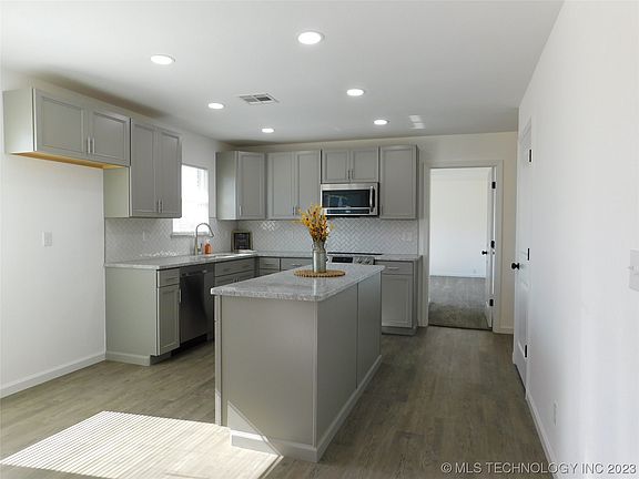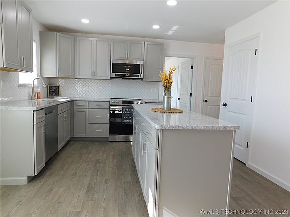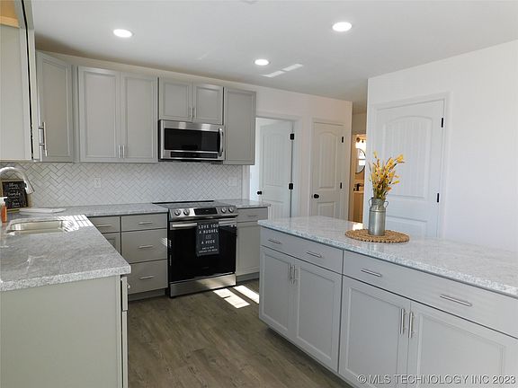 New installed in 2023: vinyl windows, window blinds, flooring throughout, range, dishwasher, microwave, doors, fixtures, hardware, kitchen cabinets, granite counter tops, toilets, bathroom vanities, mirrors, tiled surround walls in baths, mirrors, ceiling fans, light fixtures, walls in garage, privacy fence with gates, folding table in laundry, paint throughout and more. In 2019 a new metal roof covering and HVAC System was installed. Simply come and check this inviting Home out. Located in Southeast of McAlester and close to golfing at the Country Club. Only 20 min. to Lake Eufaula too!