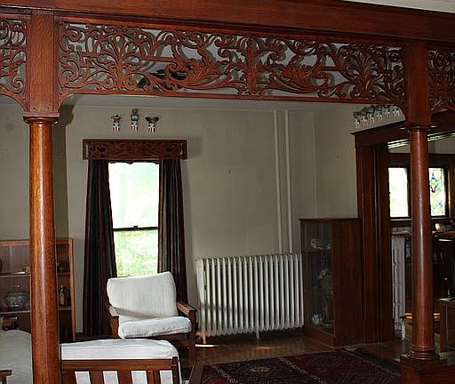 Stained glass windowsProductive cherry treeHardwood floorsNewer kitchenWooden grillworkBuilt in china cabinetDeveloped garden patch