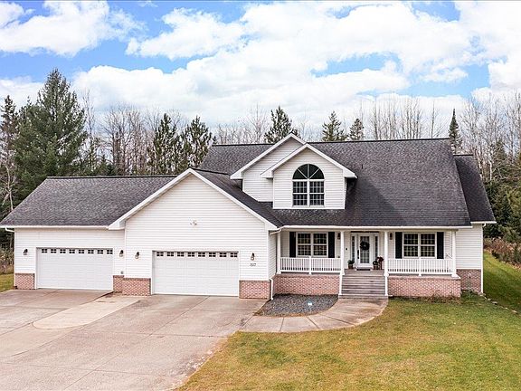 There is so much to love about this four-bedroom, four-bath home with over 4,200 sq. ft. of living space that has been lovingly planned out, built and meticulously maintained by its original owners. The captivating home is perfectly placed on a 5.37-acre lot, ready for new owners and is being offered on the market for the first time. As you pull in to the circle driveway, the front porch welcomes you and upon entering the grand foyer, you will notice the large formal dining room with oak flooring. Another attractive feature of this home is the well-thought-out office space with frosted glass French doors, built-in shelving, and two-person desk, framed by a large window with abundant natural light. Continuing into the main-floor living space, you'll be impressed by the beautiful fireplace and cherrywood trim throughout, vaulted ceiling and enough space to welcome all your guests. Entertaining is a dream in the large kitchen featuring cherry cabinets. Adjacent to the kitchen is a lovely sunroom featuring French doors providing some separation from the kitchen if desired and a patio door leading to the 12x24 maintenance-free deck overlooking the beautiful, wooded backyard and recently added paver patio with gas firepit. Back inside the home, the spacious main-floor primary bedroom with a gigantic walk-in closet and ensuite bathroom will wow you. Upstairs, you'll find two more bedrooms, both with walk in closets, and a full bathroom. The lower level is completely finished and boasts a massive recreational space for friends and family to enjoy, along with a bedroom, 3/4 bathroom and sauna - plus two extra rooms that could be used for crafting, another office or simply more storage. Solid wood, paneled doors, Marvin Windows, storage space galore and loads of natural light is found throughout the home. The insulated and heated four-stall attached garage provides comfort and convenience in the winter months and a 1/2 bath/powder room is located near that entry for convenience. There is a stackable washer and dryers on the main-floor and full laundry room in the lower level make doing laundry a beeze. A recently installed whelchair lift in the garage with 36" wide doorways, makes it accessible to all. Walking distance to Northwoods Hockey Arena and Pine Valley ski area. Don't miss out on your chance to call this one of a kind home yours!