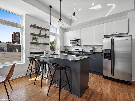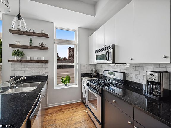 * Check out the video & the 3D walk-through of this home * Stunning & unique 2 bedroom, 1.1 bathroom top floor, end-unit, duplex-up condo in prime WICKER PARK location! This updated 3rd-floor unit has the perfect mix of vintage charm & modern updates; step into this unit and enjoy the open layout with high ceilings, hardwood floors throughout & South-facing windows that bring in lots of natural light and views of downtown. Updated chef's kitchen with black granite countertops, marble backsplash, floating shelves, and recently refinished cabinetry. Large living room with office space, separate dining area with plenty of space for a formal dining table, and a stylish main level half bathroom with custom tile work. An inviting & private East-facing deck off the living room that is perfect for grilling, relaxing, entertaining, and watching your plants grow complete this level. Walk up to the 2nd level to the primary suite with a second private outdoor space with panoramic skyline views, a large walk-in closet, and an updated magazine-quality bathroom with designer finishes, dual vanity sinks, custom mirror, lighting, and tub/shower combo. A gracious 2nd bedroom with ample closet space, a dedicated in-unit laundry closet, and a storage space that can flex as a workout area wrap up this level. There is abundant storage throughout the unit along with a large private storage room and a secured bike room. Several recent updates include new neutral paint throughout (2022), newly painted kitchen cabinetry (2022), 1/3 of the window panes replaced (2022), complete half bath remodel (2021), complete master bath remodel (2021), & new furnace, A/C, & hot water heater (2020) - Please ask your agent for the full list of improvements to the unit and the building. Other features include Fiber ready, Yale smart lock, Nest thermostat, Nest Protect (Smoke/Carbon Monoxide Alarm), and updated light fixtures. Low HOA assessment of $264.47 per month includes water, common insurance, exterior maintenance, lawn care, garbage, and snow removal. Convenient, optional garage parking across the alley at 1645 W Pierce Ave. for $185 per month. Extremely healthy association with approx. $38,426 in reserves and no special assessments. All BRICK building, gut rehabbed in 2004. 12 total units, 8 owner-occupied, 4 rentals. Rentals allowed, no short-term rentals. Cats & dogs allowed (No breed restrictions, 80 lbs. weight limit). Fall in love with all that Wicker Park has to offer - Extremely walkable to transit (Damen Blue Line train stop & bus stops), popular restaurants/bars/retail, coffee shops, 606 trail, abundant green space, and easy highway access. Welcome home!